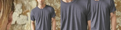4.5 oz., 60% combed ringspun cotton/ 40% polyester fine jersey; 4.5 oz., 100% combed ringspun cotton jersey; Easytear™ label; contrasting topstitched self-fabric sleeve stripes; double-needle hemmed sleeves and rounded bottom; sideseam construction; fit: ladies' modern - semi-fitted ; taped neck; v-notch with raw serge finished edge;